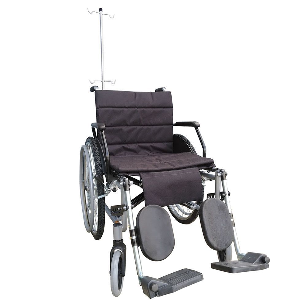 Fabricada em aço carbono, pintura epóxi, dobrável em x, duplo x, assento/encosto em nylon almofadado, acompanha almofada, apoio para braços escamoteavel, apoio para os pés com elevação de panturrilha e regulagem de altura, freios bilaterais, aro impulsor bilateral, rodas dianteiras aro 06″ com pneus maciços e rodas traseiras aro 24″ com pneus infláveis. Opcional Suporte de soro e suporte de oxigênio.